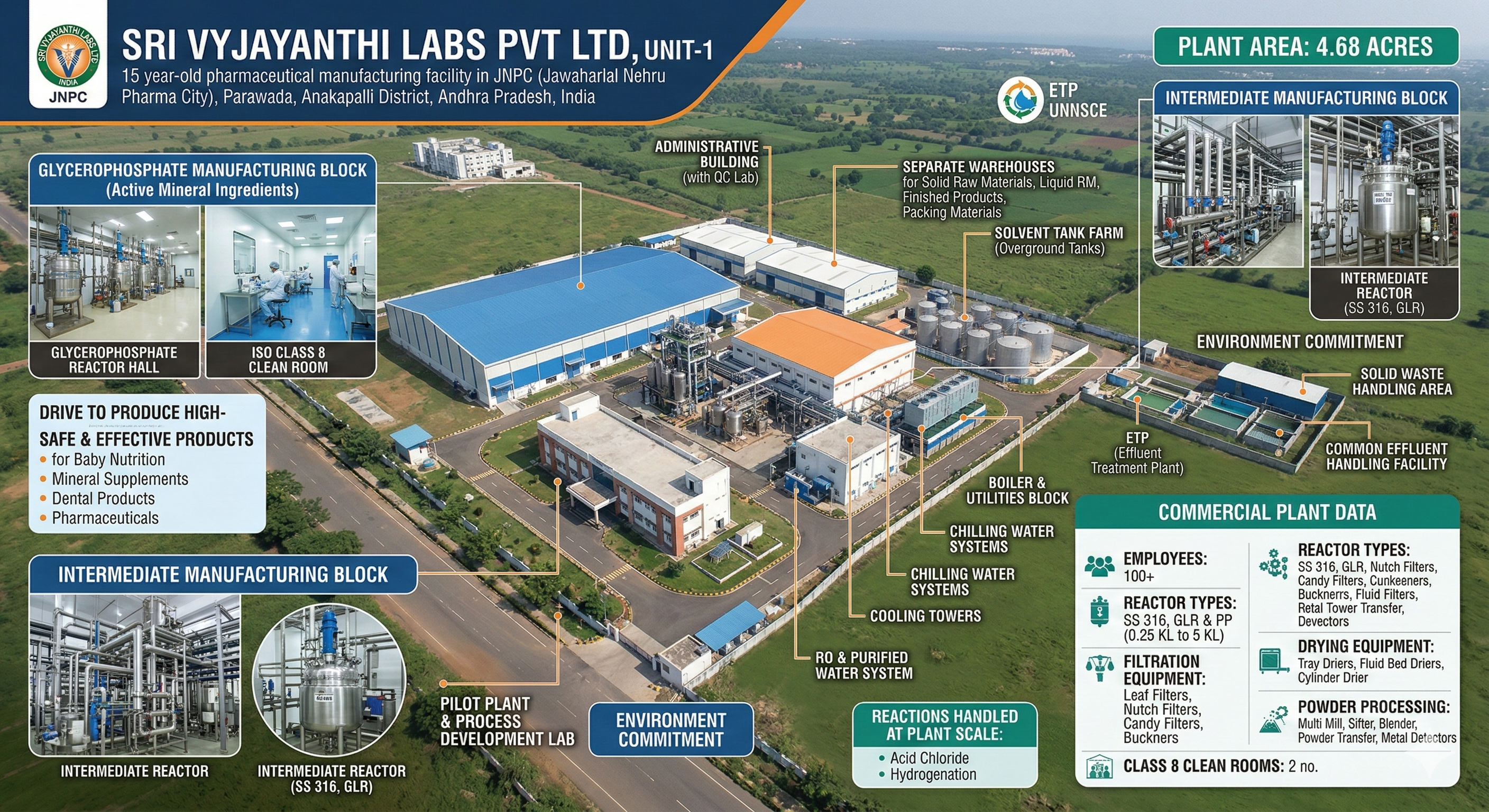 At Unit-1, the infrastructure facilities include, an Intermediate Manufacturing block, an dedicated Glycerophosphate Manufacturing Block, an Pilot Plant, an process development Lab, two ISO Class 8 Clean rooms and separate warehouses for Solid & Liquid raw materials, Finished products and Packing materials and separate over the ground solvent tanks for handling bulk solvents.